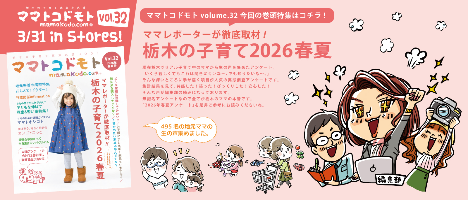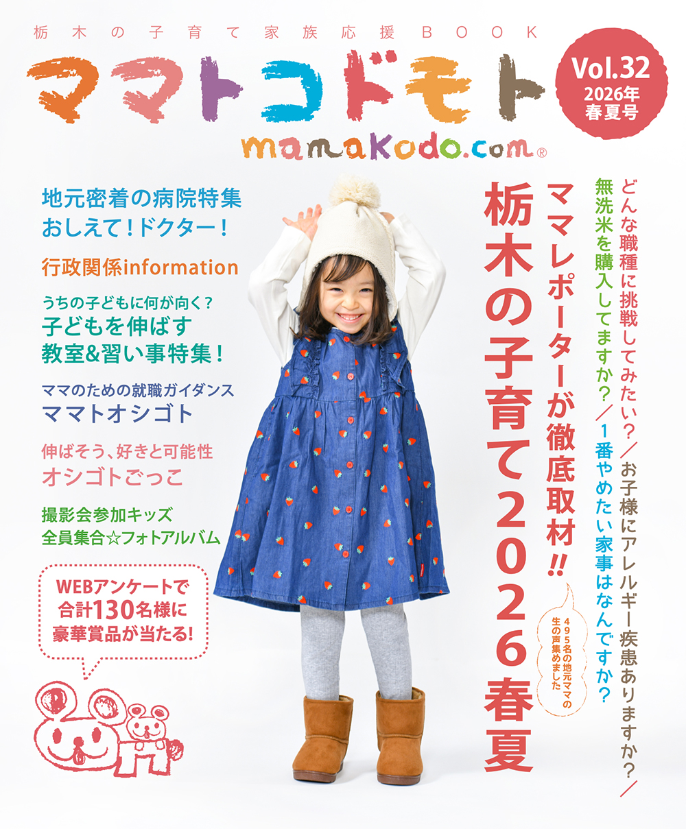 ママトコドモトは、栃木県の育児中のママ向けの地元密着情報誌。編集しているのも全員育児中のママやパパ。小さいお子様を持つお母さんが本当に欲しい情報を集めて、徹底的な「ママ目線」にこだわって編集しています。本は年2回、フリーペーパーは毎月発行しています。