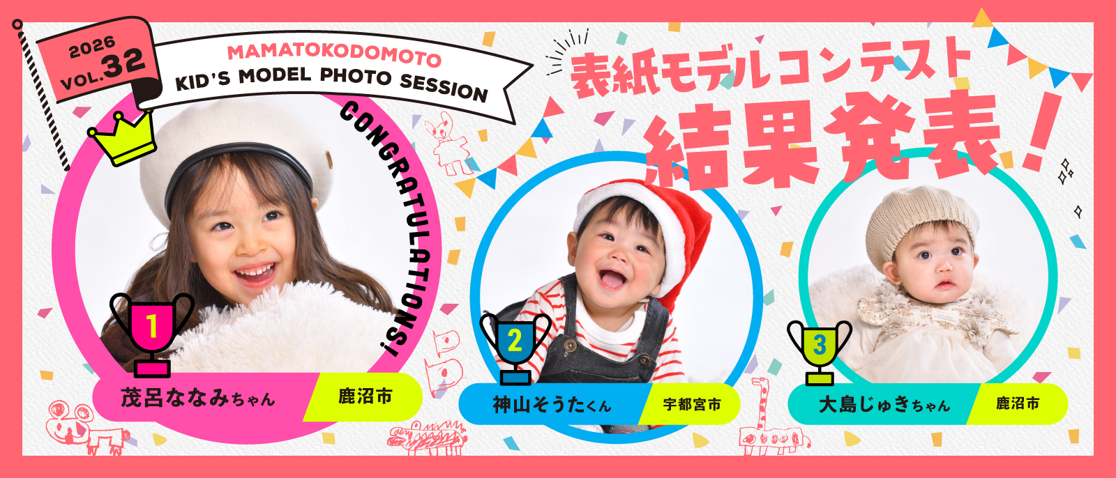 本の発行に合わせて、年2回開催。撮影させていただいたお写真は、インターネットで人気投票を行い、グランプリに選ばれたキッズは、次号ママトコドモトの表紙を飾ることができます♪ リピーターさんも多いとても人気のあるイベントです。